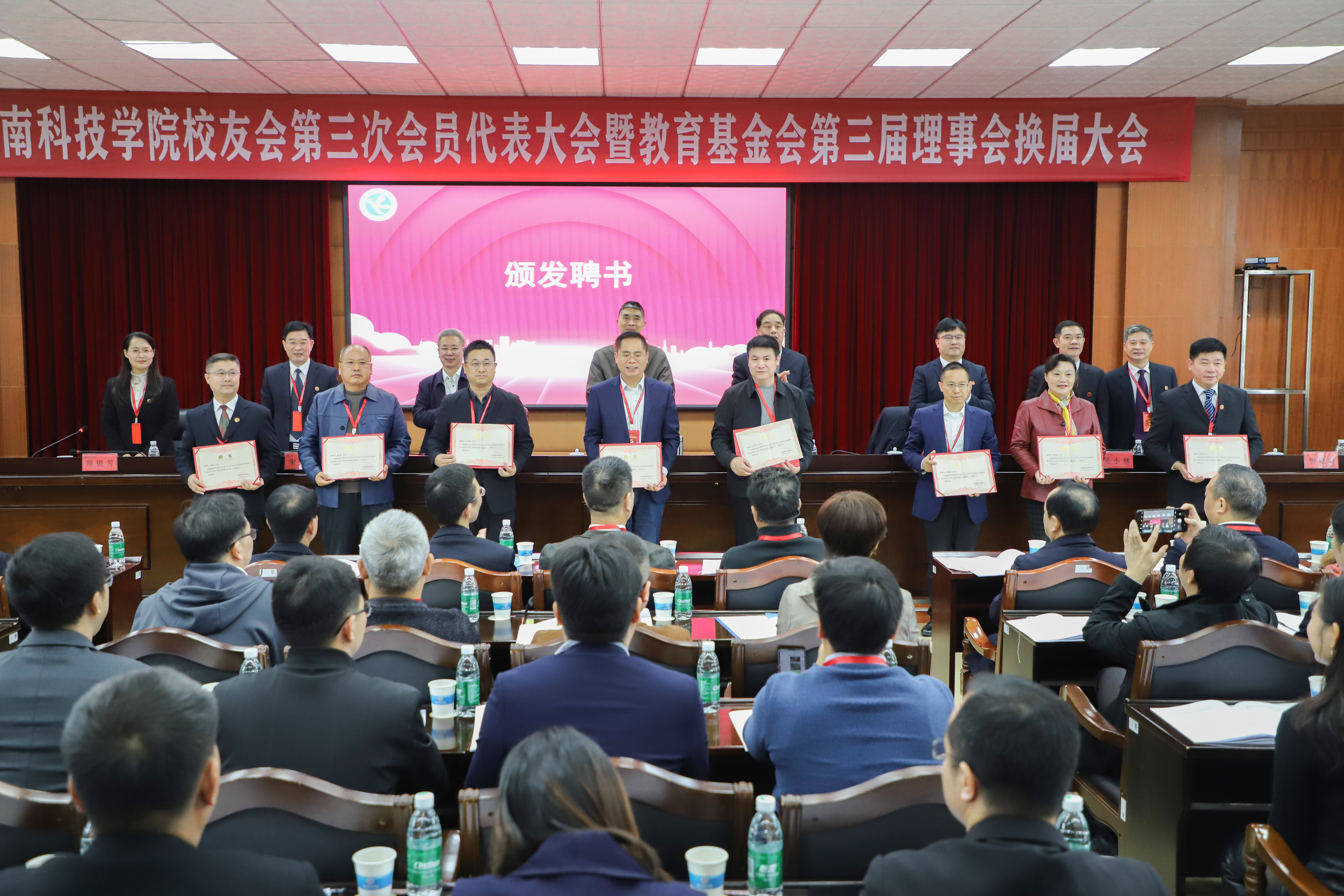 李钢为陈建民、管天球、曾宝成三位领导颁发顾问聘书。陈建民、管天球、曾宝成以及校领导为校友会第三届理事会、教育基金会第三届理事会负责人颁发聘书。