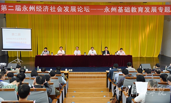 本网讯 (记者 张云芳) 5月8日,为实现高等教育与基础教育无缝对接、互利共赢,由我校与永州市教育局联合主办的第二届永州经济社会发展论坛在尚美楼二楼演播厅举行,来自永州市县区教育局负责人、教科院专家、中学校长代表、我校教师代表等200余人就“永州基础教育发展”这一主题开展热论。省教育厅党组成员、副厅长葛建中,永州市政府副市长刘尤碧出席开幕式并讲话,湖南省教育厅高等教育处处长唐利斌,永州市教育局党组书记、局长蒋俊林,永州市教科院院长严中斌及我校全体在家校领导出席。开幕式由校党委书记陈弘主持,校长曾宝成致辞。