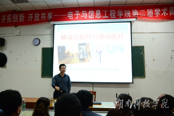 26日晚,中南大学信息科学与工程学院院长、博士生导师邹北骥教授的学术讲座受到师生热烈欢迎,现场座无虚席,学术周活动达到高潮。他以《移动互联网与移动医疗》为题,用“互联网+”的战略眼光来解读信息技术和传统产业“生态融合”的全新定位。邹北骥讲解了当今信息技术领域移动互联网、大数据、云计算等热门话题的内容、意义及其应用,并结合当前医院信息化技术存在的普遍问题,以自身的科研工作为例,详细介绍了移动医疗的相关技术和发展趋势。他认为,“互联网+”全面应用到第三产业,极大地促进了传统行业的升级换代,将互联网应用到医疗领域,为医疗产业带来了新的机遇,提供了广阔的发展空间。
