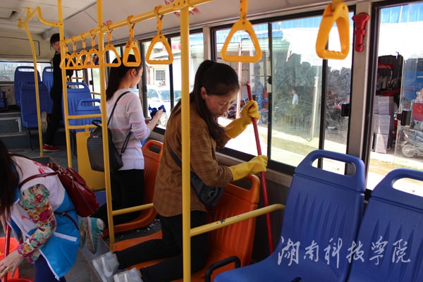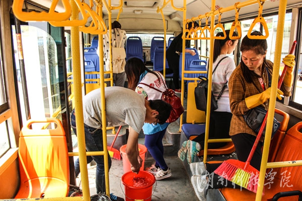 志愿者们分成两组,一组负责清洗公交车身,另一组负责清洗车厢。每一辆公交车进站停稳后,志愿者们立即进入车厢分头行动,男生提水、扫地、拖地,女生擦洗栏杆、扶手和车窗,不放过座椅下任何一个死角。每清洗完一辆公交车后,志愿者们就会把他们制作好的文明标语贴在公交车最显眼的地方,是为了让乘客们记住在公交车上以及其他的公共场合要讲卫生、讲文明。