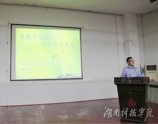 本网讯(通讯员 廖群峰)4月19日晚,2016年安全教育月启动仪式暨法制专题讲座在博雅楼东三阶梯教室举行。零陵区公安分局常务副局长唐少华应邀作题为“掌握平安知识、守护平安人生”的讲座,来自各学院的二百余名学生代表聆听了此次讲座。