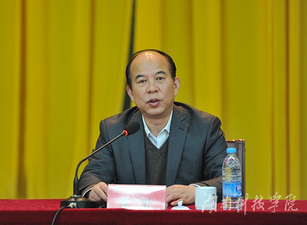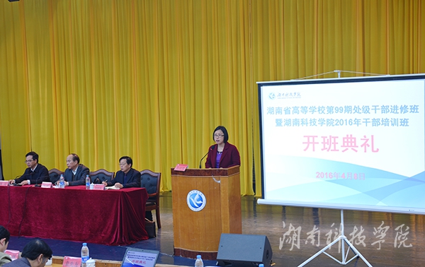 本网讯 4月8日上午,湖南省高等学校第99期处级干部进修班暨我校2016年处级干部培训班开班典礼在尚美楼二楼演播厅举行。省委教育工委组织部部长蒋明,省高校干部培训中心书记、省教育工委党校副校长刘国华及学校党委书记陈弘、校长曾宝成等在家校领导出席开班典礼。典礼由陈弘主持。