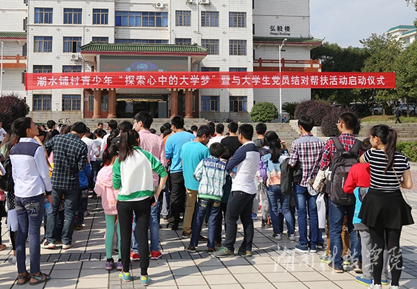 本网讯(记者 何霞 实习记者 杨光月)11月7日上午,我校驻村帮扶扶贫点新田县冷水井乡潮水铺村青少年“探索心中的大学梦”暨与大学生党员结对帮扶活动启动。56名大学生党员志愿者和潮水铺村的孩子们结对帮扶,携手共筑孩子们的美丽大学梦。校党委副书记唐艳明、组织部部长卢桂珍热情迎接了远道而来的孩子们。