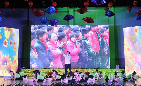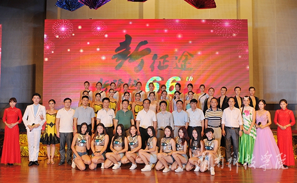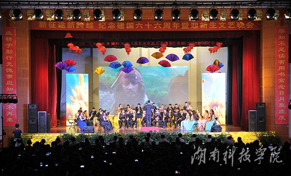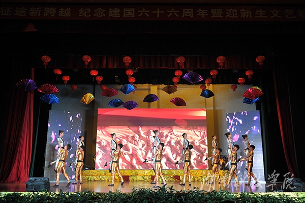本网讯 (记者 李好 胡翠芳 龙夏萍 摄影 何帅文)9月29日晚,学校在体育馆举行庆祝建国66周年暨迎新文艺晚会。陈弘、曾宝成、宋宏福、吴小林、程智开、袁先友等校领导与近4000名新生共同观看晚会。