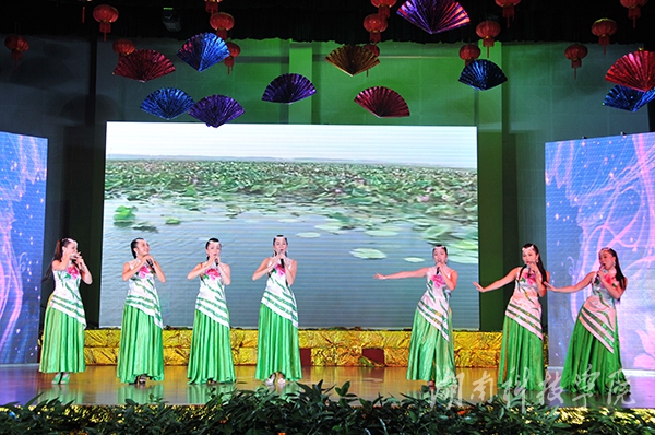 晚会在由风荷艺术团管乐团带来的《加勒比海盗》·《自由之神序曲》拉开序幕,婉转跌宕的音律,磅礴恢弘的气势将现场师生带入唯美的音乐梦境中;教工团总支带来的快板《欢声笑语赞科院》,让新生们再一次对即将伴随自己四年的母校有了更新的认识;经济与管理学院、理学院、外国语学院的表演者们则以“舞力对决”的形式各自上场,用时下流行的韩舞和街舞互相PK,绚丽热辣的街舞表演将晚会推向高潮;“绿草苍苍,白雾茫茫,有位佳人,在水一方……”