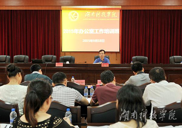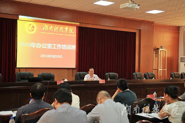 本网讯(记者 裴滢 摄影 何帅文)9月18日,学校二级单位综合办主任(办公室工作负责人)培训班在行政办公楼八楼会议室举行。校党委书记陈弘出席并讲话。中共零陵区委常委、区委办主任、我校94级校友彭江辉等领导、专家应邀讲课。