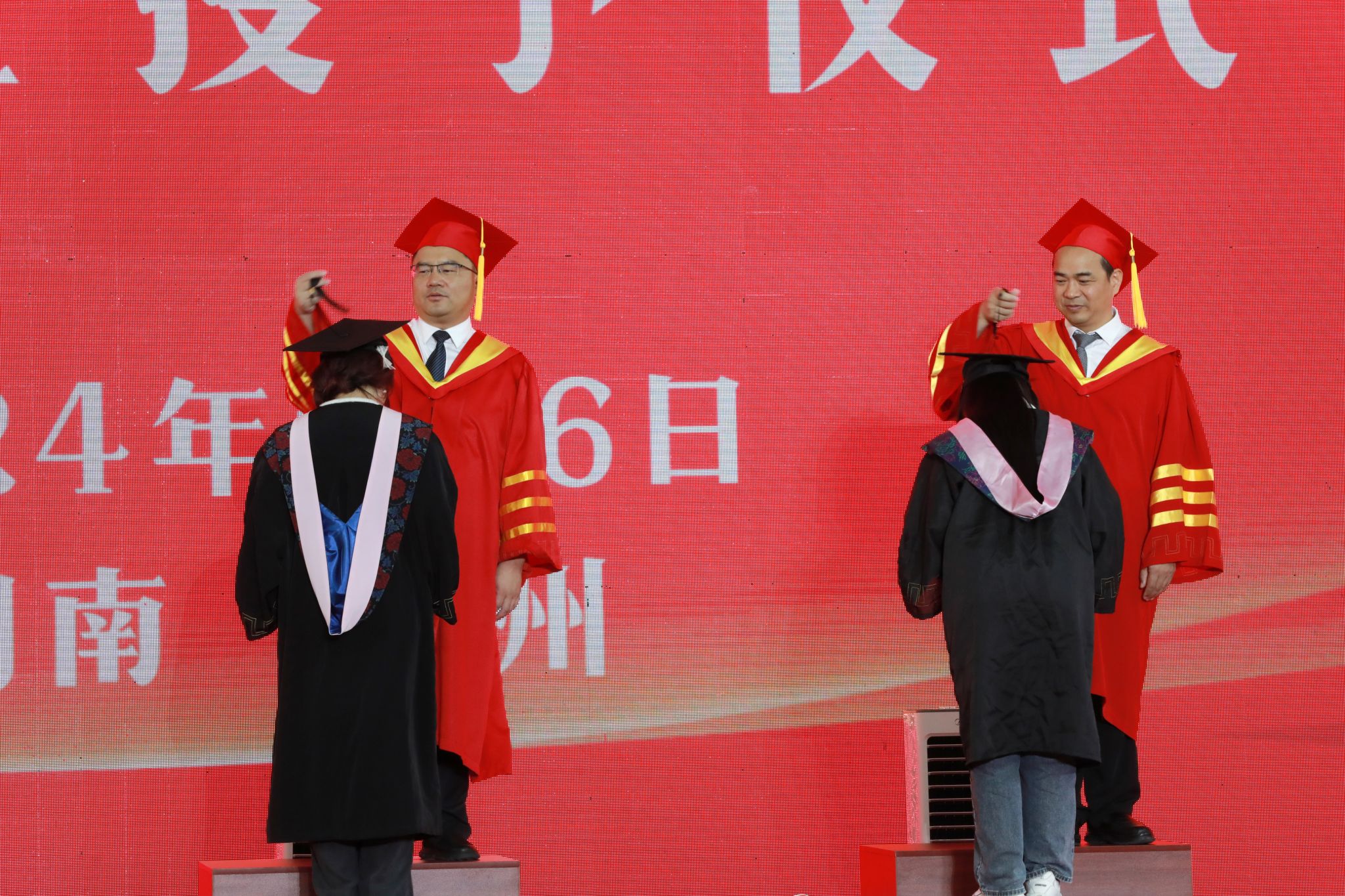 学位授予仪式上,全体校领导为毕业生拨穗并颁发毕业证书,为他们的大学四年划上了圆满句号。