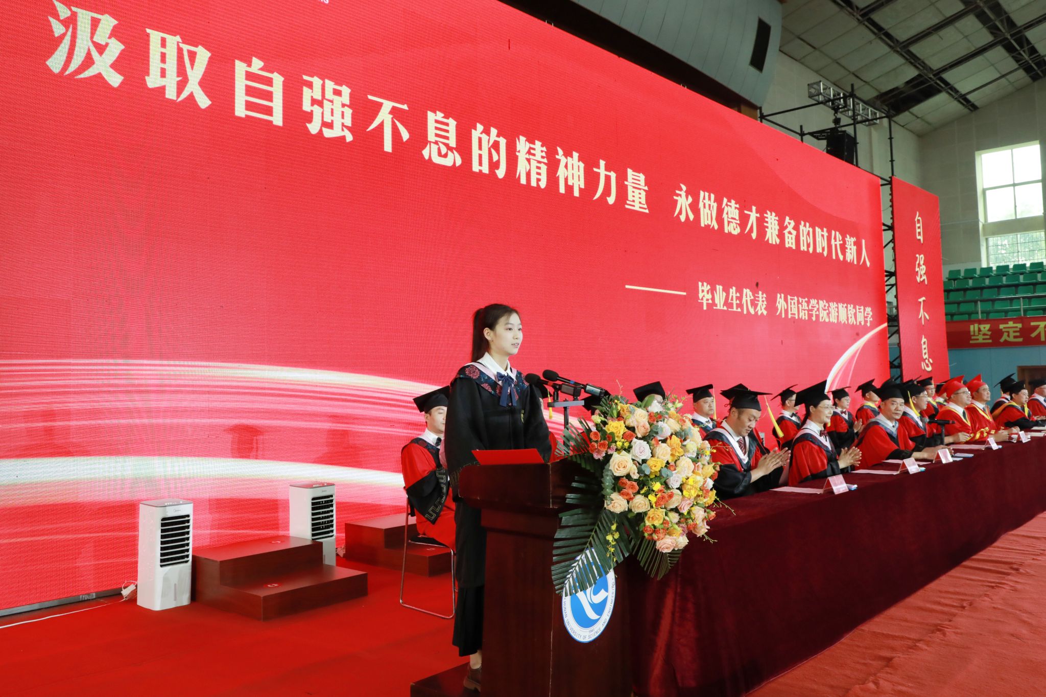 2024届毕业生、英语2005班游顺钦同学代表全体毕业生向学校、老师、家人和朋友们致以最崇高的敬意和最深切的感激。她呼吁全体毕业生要不断用汗水去书写无限可能的青春。