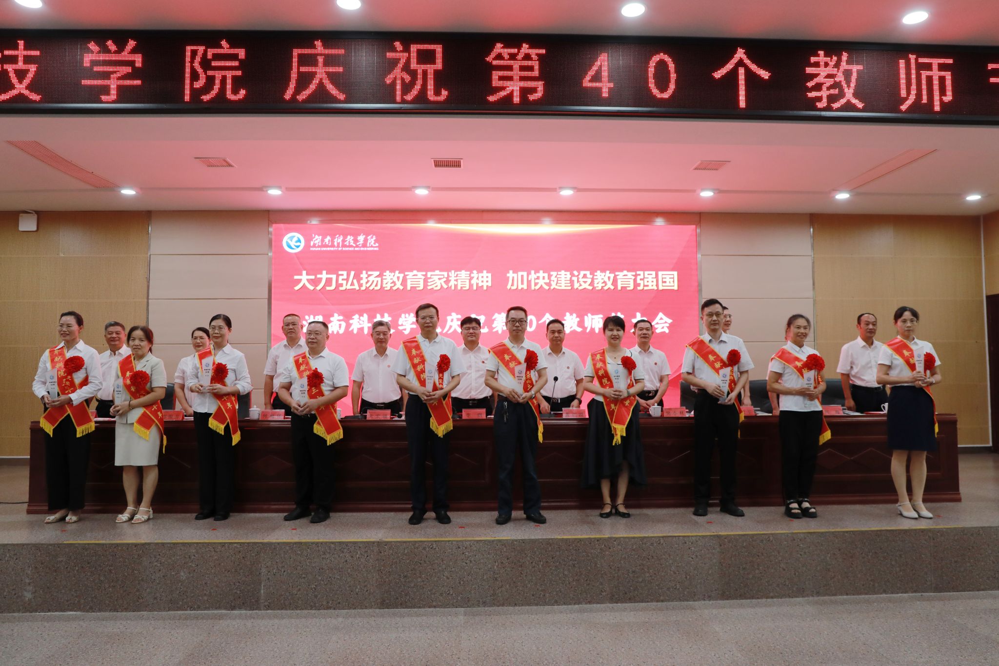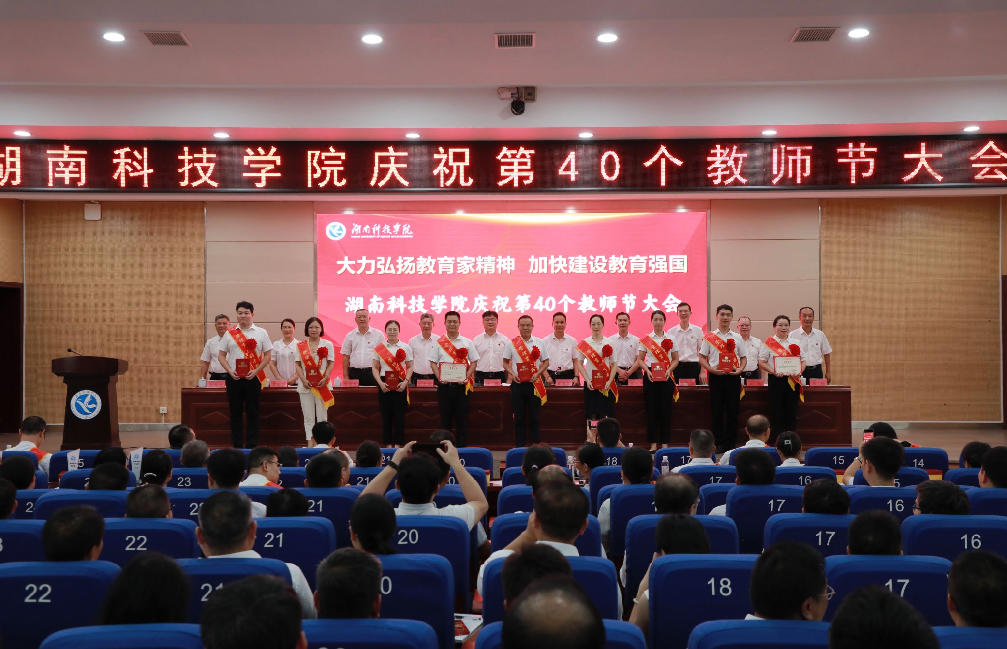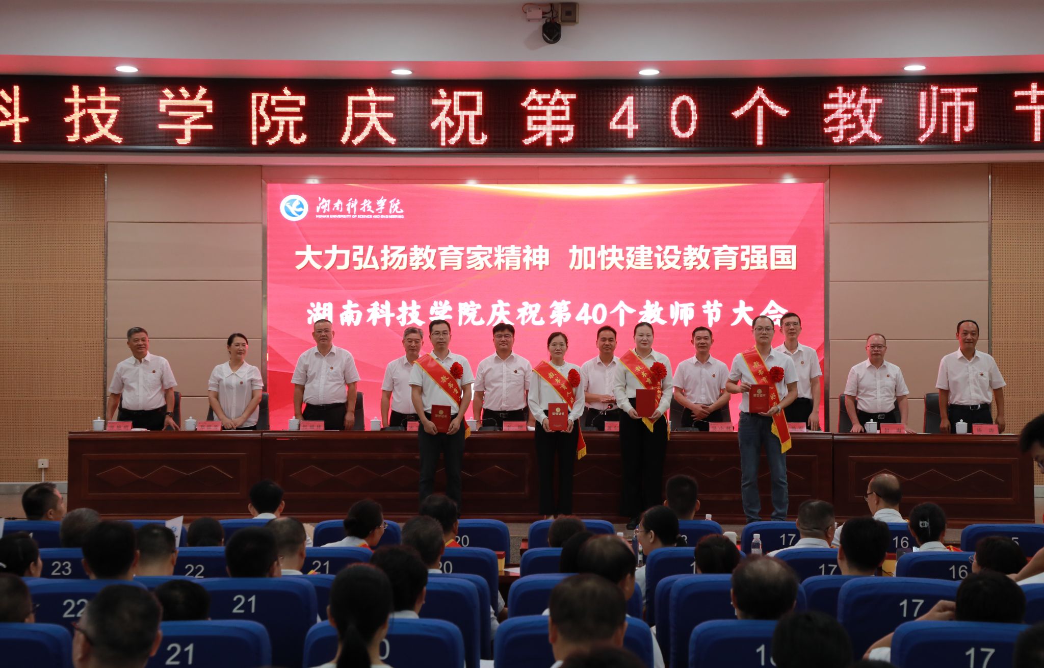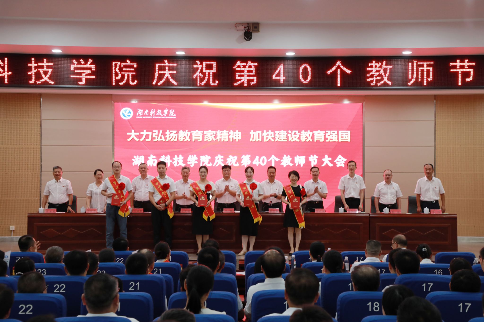 本网讯 (记者 孙淑娴 摄影 谢志豪)9月10日,学校在潇湘大讲堂举行庆祝第40个教师节暨优秀教师表彰大会,校党委书记李钢、校长黄创霞,校领导宋宏福、吴小林、何福林、陈灿军、郑银芳、何海,党委委员、组织部部长杨涛以及受表彰对象、新进教师、全体中层干部、教学学院教师代表参加会议。会议由黄创霞主持。