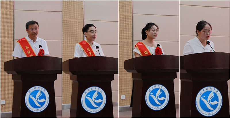潘雁飞从他三十年如一日的坚守出发,用“学习”“尽职”“尽责”“看淡”“慎独”五个维度分享了学无止境的真谛,展现了人民教师的时代风采;覃佐东以返乡10年干事创业的事迹为引,分享了其扎根科院、潜心科研的感悟和收获,展现了青年教师的奋进拼搏;胡维立足因材施教,将“五守五创”核心理念融入教学实践,切实提升育人实效,展现了青年教师的躬耕态度;张倩从爱心、责任、使命和创新四方面,讲述了对教育事业的憧憬,展现了新进教师的精神风貌。