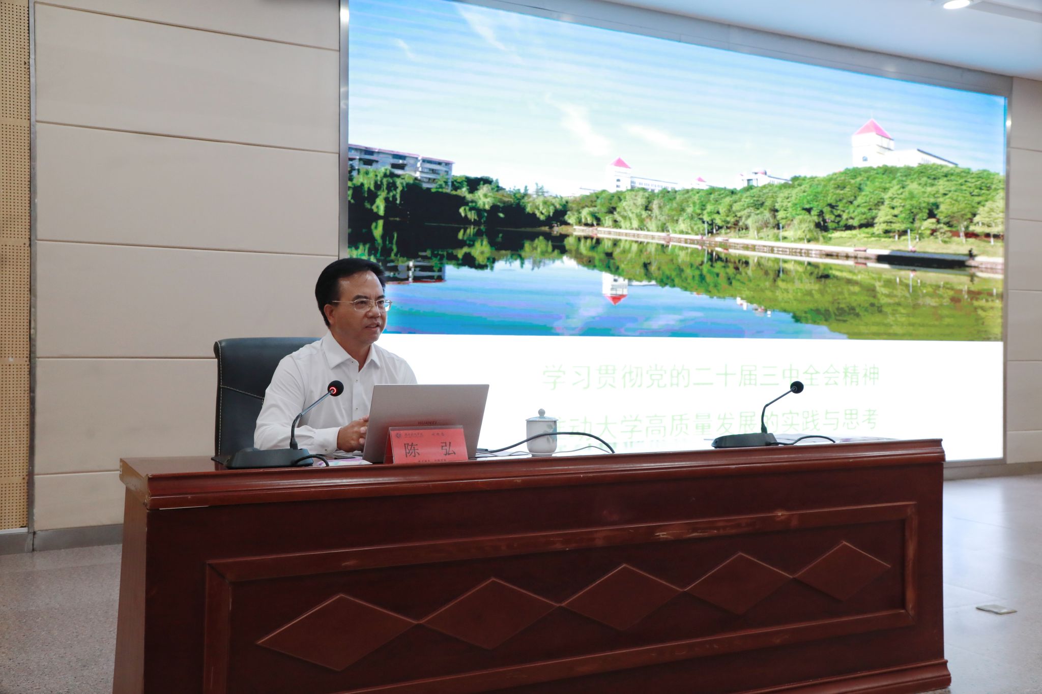 陈弘领学了习近平总书记在党的二十届三中全会上的重要讲话精神,结合自身的办学治校经验实际,重点围绕“深刻领会习近平总书记关于教育工作的重要论述和党的二十届三中全会对教育科技人才工作的部署”、“准确把握新时代新征程高等教育的使命任务”、“以切实行动推动大学和高等教育事业高质量发展”等三方面进行了系统解读。他指出,要统一思想认识、提高政治站位,将党的二十届三中全会精神贯彻到学校人才培养和事业发展的各环节各方面,积极探索教育科技人才一体化融合发展的新模式,要抓住战略发展三要素谋篇布局,紧扣五个方面真抓实干,全力以赴推进大学综合改革。