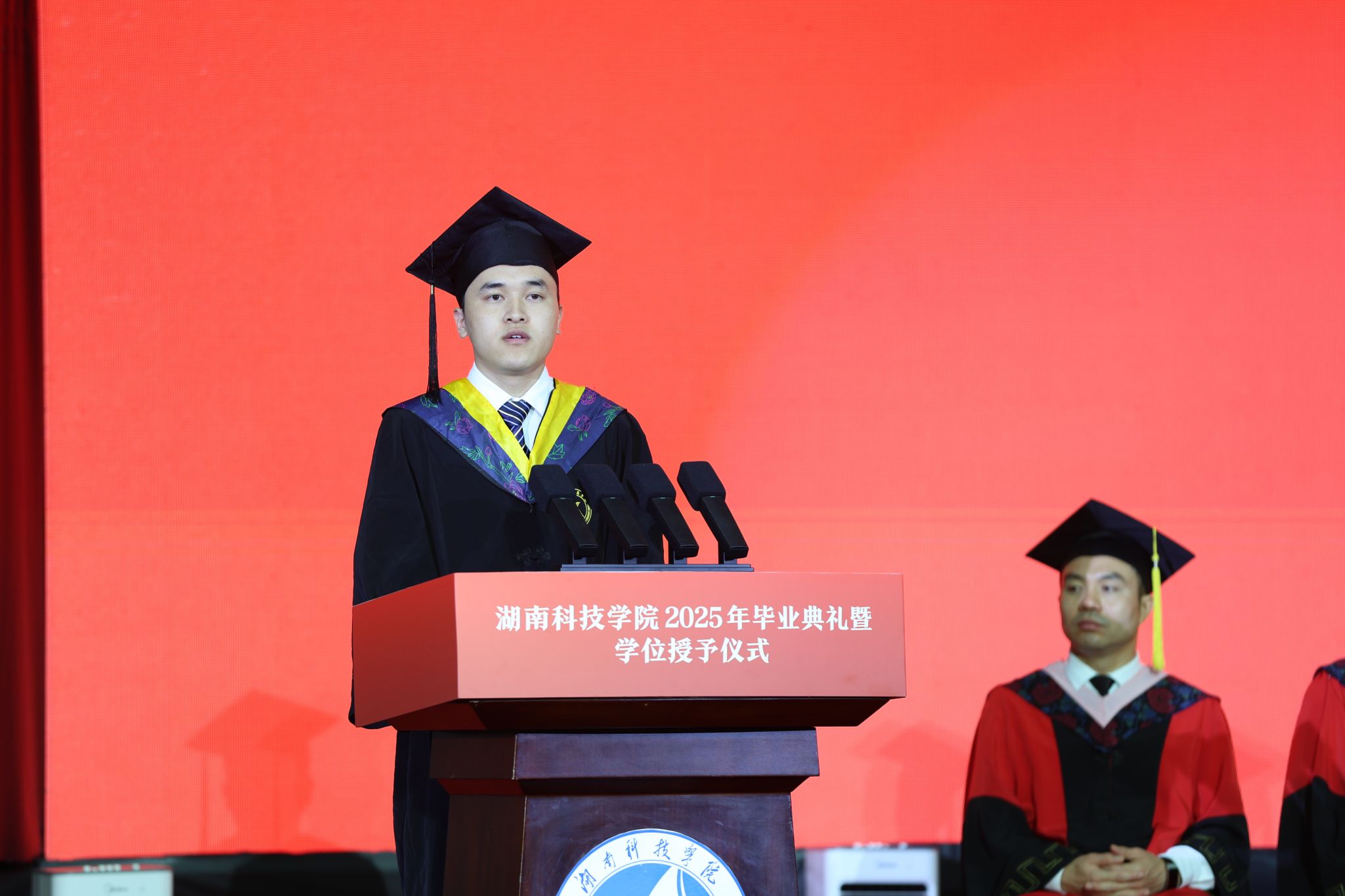 2025届毕业生、智能制造学院电科2102班龙俊和以《找准人生赛道,向未来出发》为题,代表全体毕业生向学校、老师、家人和朋友们致以最崇高的敬意和最深切的感激。他呼吁全体毕业生作未来可期的志高者,作好运加倍的实干者,作风景无限的担当者。