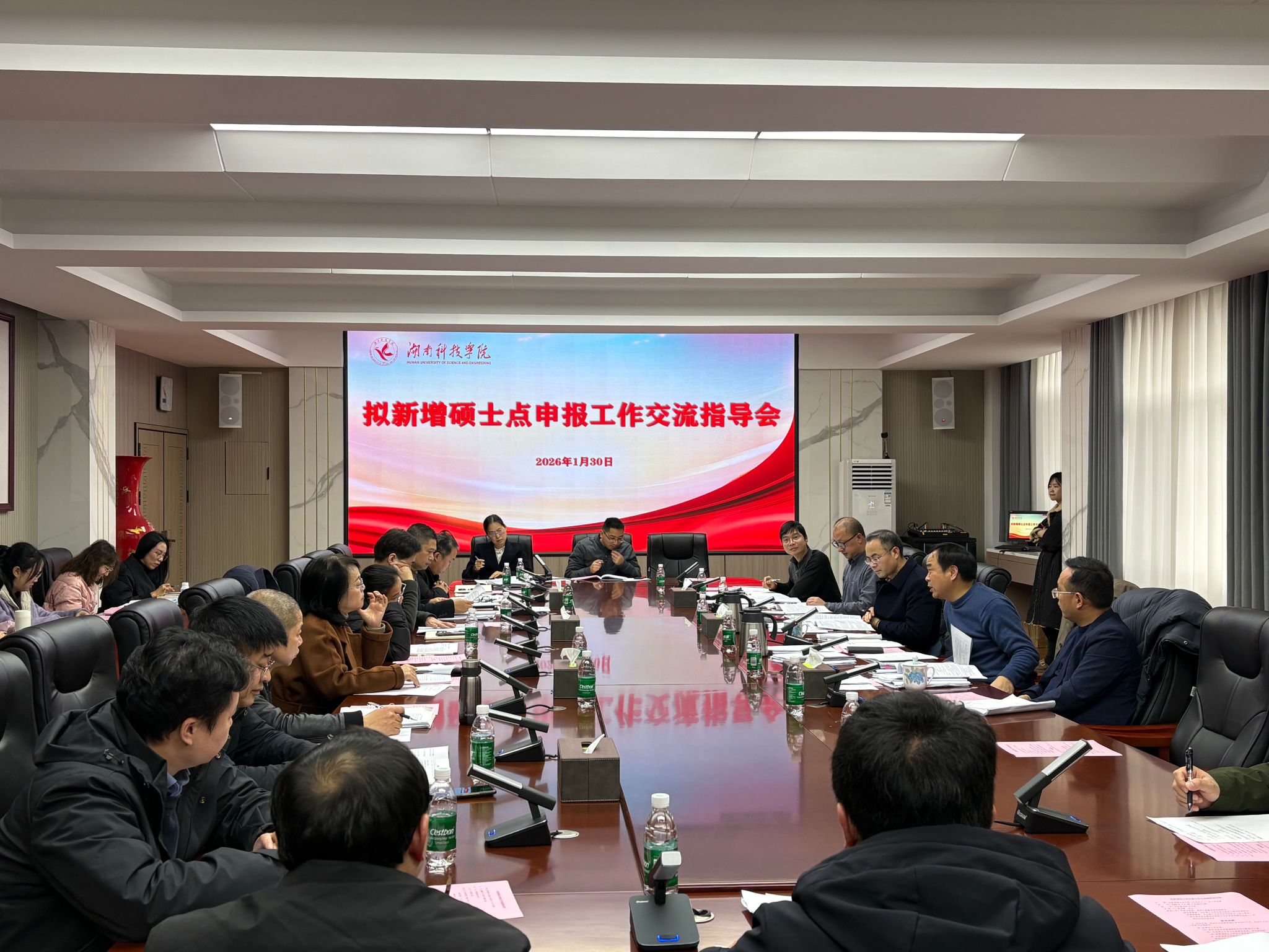 本网讯(通讯员 王宗成)为扎实推进2026年新增硕士学位授权点申报工作,1月30日上午,学校召开拟新增硕士点申报工作交流指导会。会议由校党委副书记、校长黄创霞主持。湖南大学郭振远教授,长沙理工大学王建辉教授、陈启杰教授应邀到会指导。各申报点所在学院院长、研究生院全体工作人员参加会议。