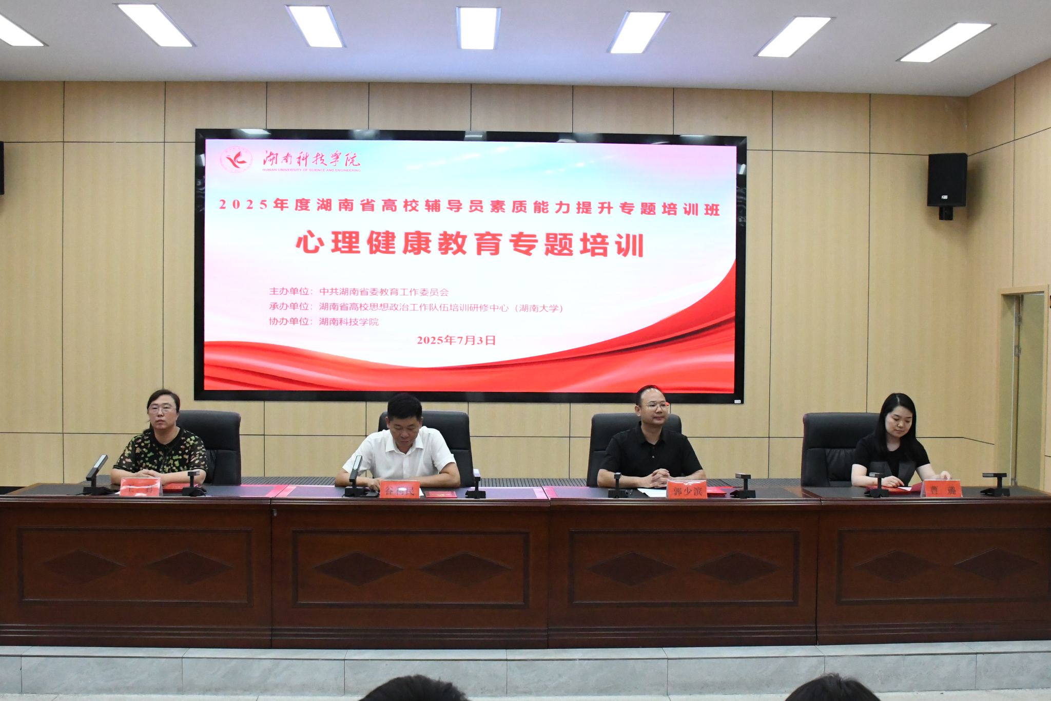 本网讯(通讯员 蔡彦婷)7月3日,2025年湖南省普通高校辅导员心理健康教育专题培训班结业仪式在我校举行。湖南省高校思想政治工作队伍培训研修中心(湖南大学)负责人、湖南大学党委学生工作部副部长郭少滨,心理健康教育中心主任曹璐,我校学生工作部部长谷利民等出席结业仪式。仪式由谷利民主持。