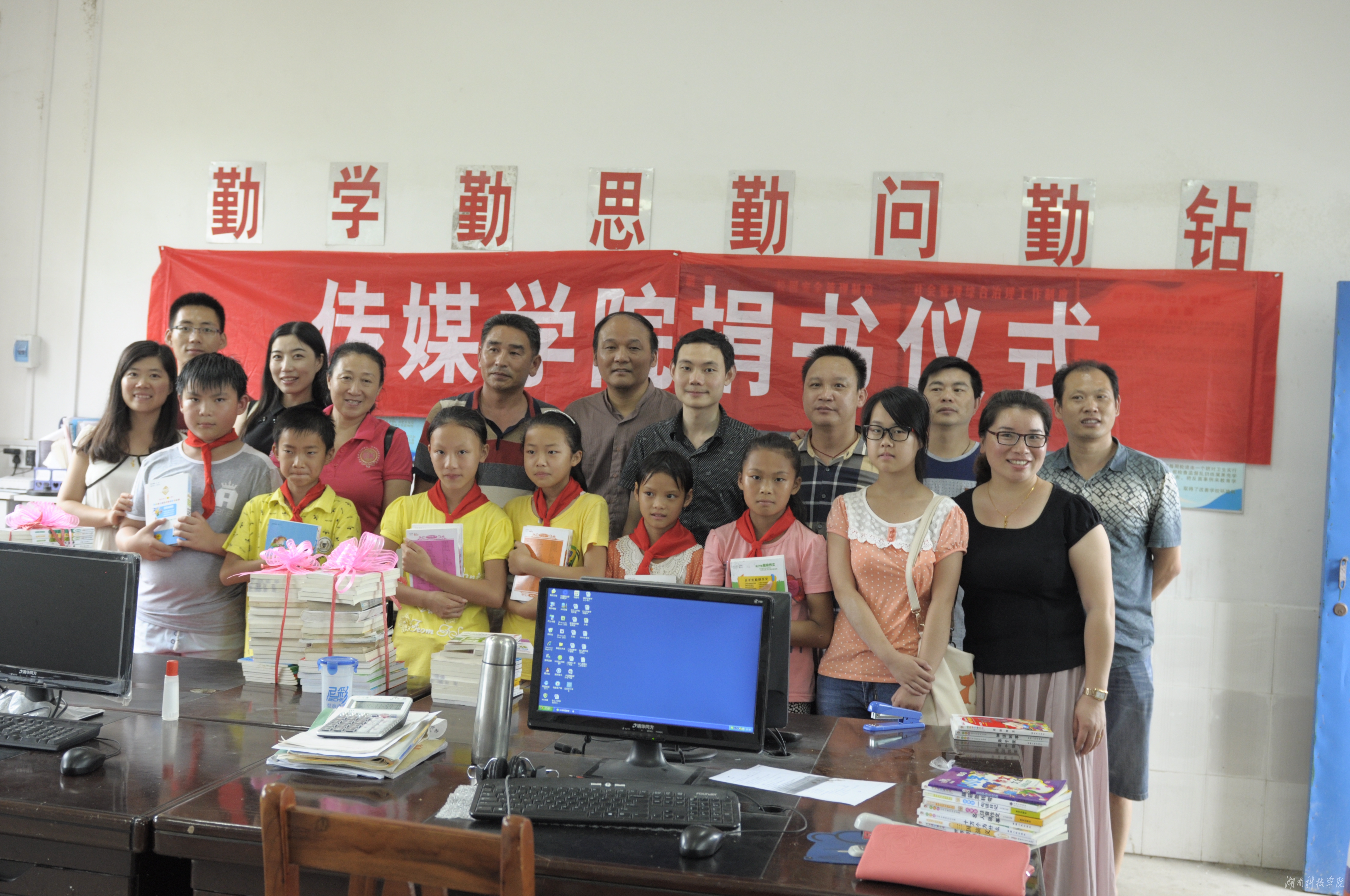 据悉,邮亭圩中心小学是传媒学院的德育实践基地,该院在该校开展了义教、爱心帮扶等一系列活动。“正值建党94周年来临之际,我们给学生捐书,这是发挥党员优良作风的一小步,却拓宽了奉献爱心,传递大爱的长远之路。”学生代表张瑞鹏说。