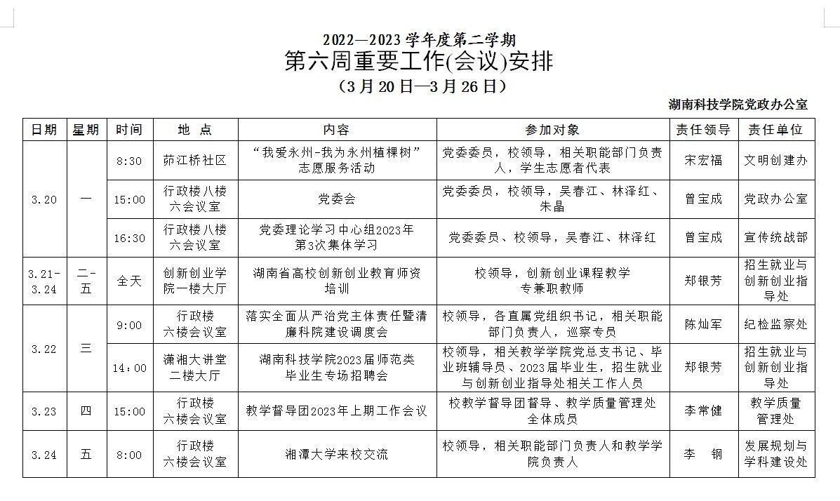 [党政办]第六周重要工作(会议)安排(3月20日-3月26日)